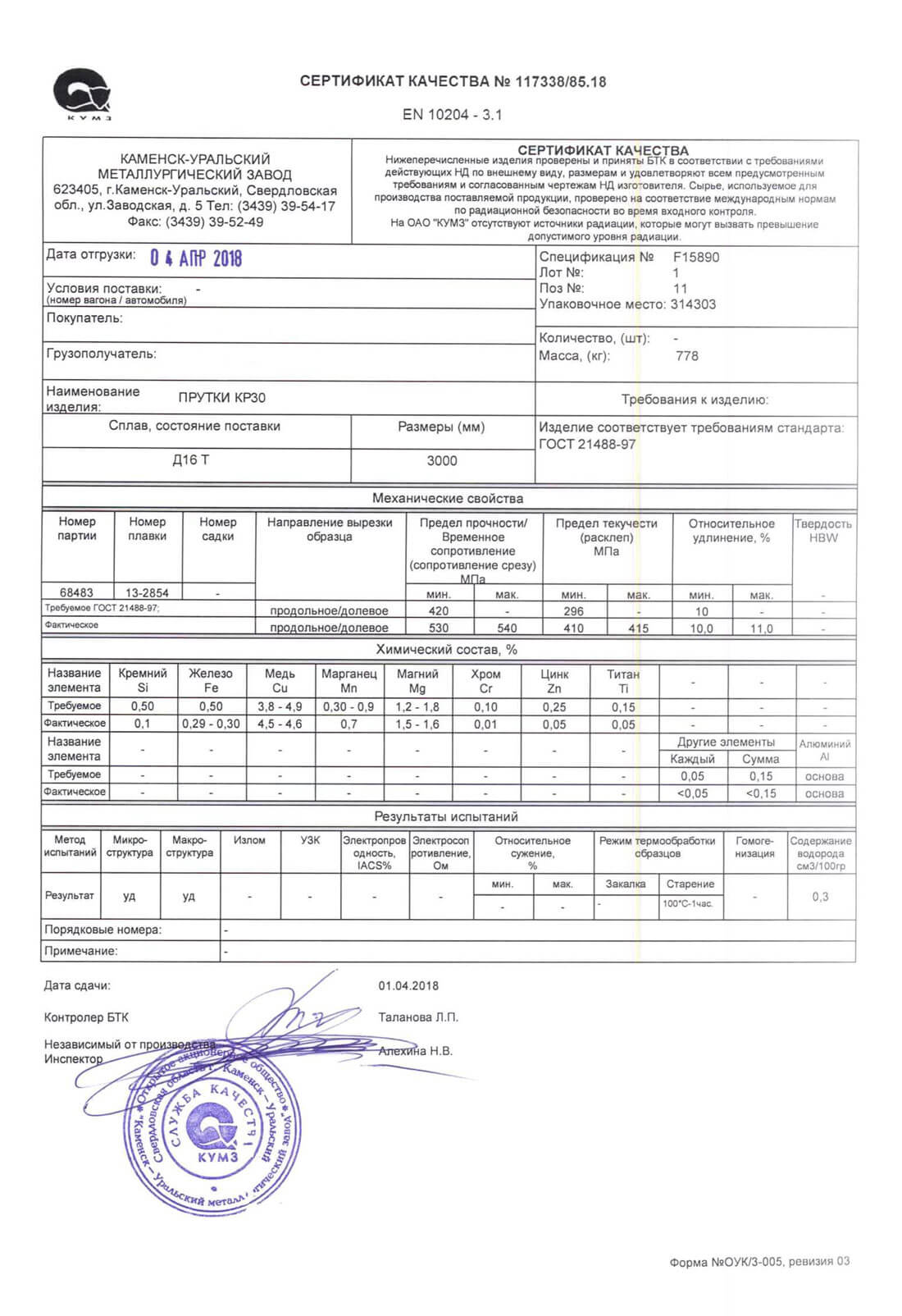 • Пруток Д16 – естественно состарен, пластичен, легко поддается резке. Обладает низкой коррозионной стойкостью при Т>80 °С, нуждается в защитном эмалевом покрытии или анодировании.